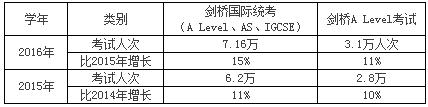 2016年,中国内地参加剑桥A Level课程统考(包括AS、ALevel、IGCSE年级)的人数为7.1651万,比2015年增长15%,远超全球增幅的10%。其中剑桥A Level考试人次为3.1万人次,比2015年增长11%。