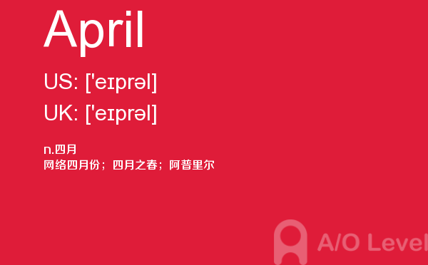 现在很多人来咨询a-level考试录取率,英国a-level考试题库的家长也依然不减,而考生们则更关心a-level教材以及a-level考试培训课程是什么样的。a/o-level考试网都会解答您。今天小编带来a/o-level考试网的内容是关于a-level词汇的April单词的详细介绍。如果您想了解alevel网上报名,alevel国际课程介绍,新加坡a水准学费,alevel范文等关于a-level考试的相关资讯,请继续浏览并关注课窝a/o-level考试网。