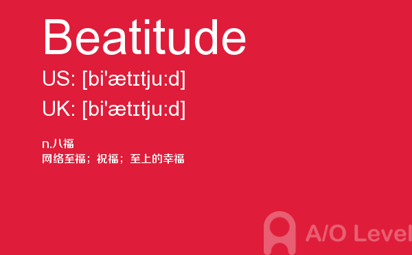 虽然英国a-level院校招生官常把“成绩不是决定录取与否的唯一因素”挂在嘴边,但不得不承认,a-level分数是学生优秀与否的有力证据,取得a-level成绩高分是肯定是优先考虑的。放松一下,先跟着a/o-level考试网来看看今天小编带来的是a-level单词Beatitude的介绍。如果您想了解alevel报考美国,alevel答案网站,上海alevel课程,在线alevel培训等关于a-level考试的相关资讯,请继续浏览并关注课窝a/o-level考试网。