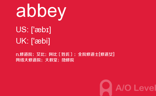 就读于国内学校的学生, 在申请英国学校时需要提交英国A-level考试成绩。很多考生因此英国A-level考试搞得头疼,放松一下,跟着A/O-level考试网来看看英国留学资讯吧!今天课窝A/O-level考试网小编给大家带来A-level考试重点词汇abbey的全解,对你肯定有帮助。如果您想了解alevel大学条件,alevel申请,alevel影视表演学什么,alevel网校等关于A-level考试的相关资讯,请继续浏览并关注课窝A/O-level考试网。