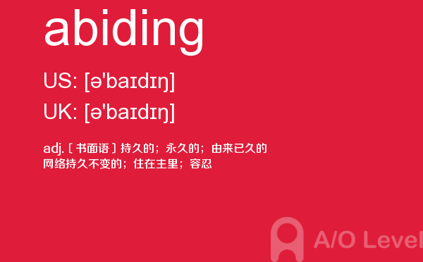 在A-level备考的过程中,想要冲刺到A-level写作的高分,相信大家都应该会知道,除了需要掌握A-level写作的一些技巧之外,优化文章中的词汇和句型也是冲刺高分的关键所在。也就是说,只有充分掌握了语法知识,才能让我们的的文章更为丰富形象。除了A-level写作,在A-level其他方面同学们也需要了解,下面课窝A/O-level考试网小编给大家带来A-level单词abiding的介绍。如果您想了解alevel写作真题,alevel写作分数,新加坡a水准报名费,新alevel等关于A-level考试的相关资讯,请继续浏览并关注课窝A/O-level考试网。