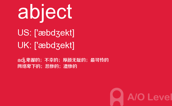 英国留学对于留学成绩的比拼越来越激烈,申请英国院校留学的一大指标A-level考试分数要求也水涨船高.虽然成绩只是申请的一部分,但不得不说,好看的英国A-level成绩是学生是否优秀的证据。放松一下跟着A/O-level考试网来学习一下A-level考试词汇abject的应用。如果您想了解高中alevel考试,alevel物理常备词汇,alevel非全日制培训,alevel是毕业考试吗等关于A-level考试的相关资讯,请继续浏览并关注课窝A/O-level考试网。
