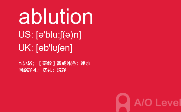 英国A-level入学考试的机会真的很少,每年就5-6月和10-11月两场考试。所以千万别因为不必要的原因,影响了A-level入学考试。为了让大家更好的在英国留学,A/O-level考试网会为大家带来A-level考试相关的资讯,一起来看看A/O-level考试网今天带来的词汇ablution的解析。如果您想了解alevel经济教材,alevel经济分类,新加坡a水准考试条件,奥克兰大学alevel等关于A-level考试的相关资讯,请继续浏览并关注课窝A/O-level考试网。