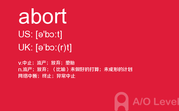 在a-level备考的过程中,想要冲刺到a-level写作的高分,相信大家都应该会知道,除了需要掌握a-level写作的一些技巧之外,优化文章中的词汇和句型也是冲刺高分的关键所在。也就是说,只有充分掌握了语法知识,才能让我们的的文章更为丰富形象。除了a-level写作,在a-level其他方面同学们也需要了解,下面课窝a/o-level考试网小编给大家带来a-level单词abort的介绍。如果您想了解alevel北京,alevel考试局,alevel科目,alevel上海等关于a-level考试的相关资讯,请继续浏览并关注课窝a/o-level考试网。