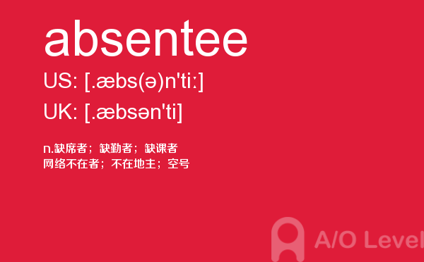 目前,a/olevel逐渐为人所熟知,很多学生都会主动了解alevel考试流程。同时也会抱怨a-level英语题比较难,任务重。那现在我们就放松一下,跟着a/o-level考试网小编来看看a-level考试中要积累的单词absentee,认真的学习积累。如果您想了解alevel都有什么课程,alevel课程怎么申请,alevel法律,alevel模考等关于a-level考试的相关资讯,请继续浏览并关注课窝a/o-level考试网。
