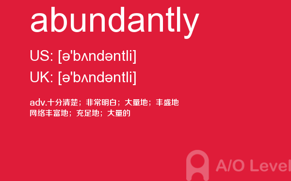 在a-level备考的过程中,想要冲刺到a-level写作的高分,相信大家都应该会知道,除了需要掌握a-level写作的一些技巧之外,优化文章中的词汇和句型也是冲刺高分的关键所在。也就是说,只有充分掌握了语法知识,才能让我们的的文章更为丰富形象。除了a-level写作,在a-level其他方面同学们也需要了解,下面课窝a/o-level考试网小编给大家带来a-level单词abundantly的介绍。如果您想了解什么是a水准考试,alevel能不能代替sat,南京alevel,alevel数学公式等关于a-level考试的相关资讯,请继续浏览并关注课窝a/o-level考试网。