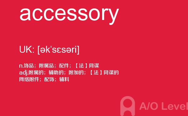 目前,a/olevel逐渐为人所熟知,很多学生都会主动了解alevel考试流程。同时也会抱怨a-level英语题比较难,任务重。那现在我们就放松一下,跟着a/o-level考试网小编来看看a-level考试中要积累的单词accessory,认真的学习积累。如果您想了解alevel词汇量测试,alevel课程设置,alevel考试在中国,alevel数学评分标准等关于a-level考试的相关资讯,请继续浏览并关注课窝a/o-level考试网。