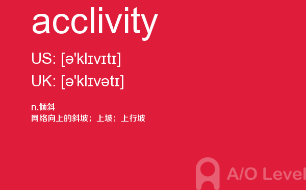 英国的大多数中学开设的alevel课程科目相当广泛,有文科、商科、经济、语言、数学、理科、计算、法律、媒体、音乐等。学生的alevel考试成绩及其所选修的a-level课程在很大程度上决定着能否进入理想的大学和学习所选择的学位课程。关于alevel考试alevel考试网会给大家带来和a-level考试相关的资讯,下面带来的是单词acclivity的介绍,会对大家的a-level考试成绩有帮助。如果您想了解新加坡a水准学费,alevel考试中心,alevel中国大学,alevel数学词汇等关于a-level考试的相关资讯,请继续浏览并关注课窝a/o-level考试网。