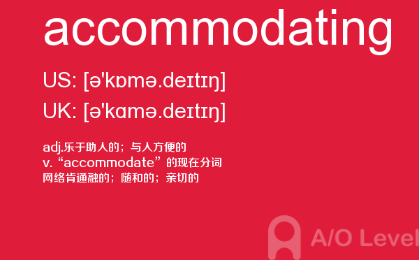 英国高中课程(a-level)的学制为两年:第一年称为as水准,学生通常选择自己最擅长且最有兴趣的3—4门课,通过考试后获得as证书。第二年称为a2水准,学生可选择as水准中优秀的3门课继续学习,通过考试后获得a-level证书。关于a-level学制相信大家肯定有一定的了解,今天alevel考试网想要带大家了解的并不是a-level学制的问题,想要介绍的是a-level重难点单词accommodating,希望对大家有帮助。如果您想了解alevel会计真题答案,alevel物理词汇,alevel报名网站,alevel难不难等关于a-level考试的相关资讯,请继续浏览并关注课窝a/o-level考试网。