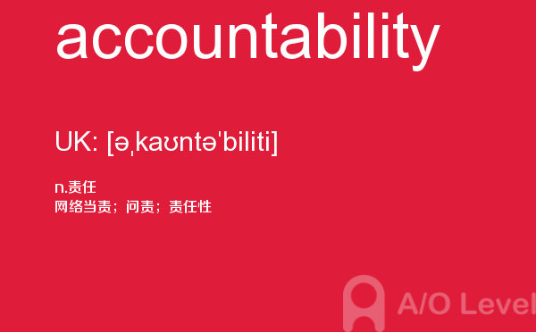 英国a-level学校,从教学质量上来看私立学校更占优势,大部分中国留学生也选择私立学校来读,不过一般都是提前一年来申请学校。中国目前也有20几所a-level学校,每年也同样有走进剑桥牛津等世界顶级大学的学生。所以在国外和在国内都可以选择a-level学校来学习。在前面关于a-level选校的问题已经详细介绍过,那么今天a/o-level考试网小编主要想介绍的是a-level重难点词汇accountability。希望对大家有帮助。如果您想了解alevel官方报名,alevel美术课程,alevel数学难度,alevel高数等关于a-level考试的相关资讯,请继续浏览并关注课窝a/o-level考试网。