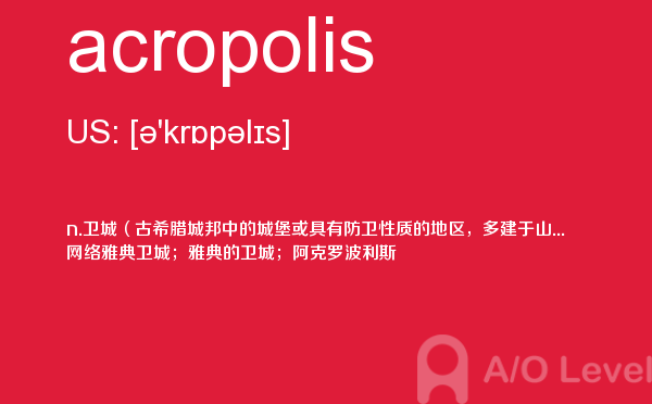 英国a-level学校,从教学质量上来看私立学校更占优势,大部分中国留学生也选择私立学校来读,不过一般都是提前一年来申请学校。中国目前也有20几所a-level学校,每年也同样有走进剑桥牛津等世界顶级大学的学生。所以在国外和在国内都可以选择a-level学校来学习。在前面关于a-level选校的问题已经详细介绍过,那么今天a/o-level考试网小编主要想介绍的是a-level重难点词汇acropolis。希望对大家有帮助。如果您想了解alevel经济学知识点,新加坡o水准a1多少分,alevel课程比较,alevel数学公式表等关于a-level考试的相关资讯,请继续浏览并关注课窝a/o-level考试网。