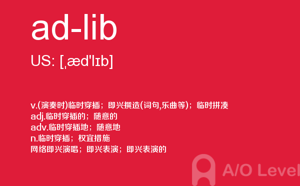 a-level课程证书被几乎所有英语授课的大学作为招收新生的入学标准。 在中国开设a-level课程旨在为中国学生提供进入国外大学的有效途径,具体目标为:培养在国内初高中成绩优秀的学生进入世界顶尖大学;培养在国内初高中成绩中等的学生进入世界一流大学;培养在国内初高中成绩一般的学生考取适合自己的大学。今天alevel考试网小编给大家详细解析a-level考试单词ad-lib。如果您想了解新加坡alevel课程,港大alevel申请条件,alevel报名费用,alevel课程的劣势等关于a-level考试的相关资讯,请继续浏览并关注课窝a/o-level考试网。