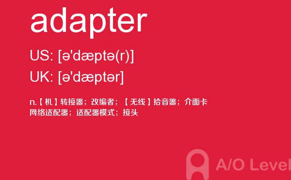 a-level课程证书被几乎所有英语授课的大学作为招收新生的入学标准。 在中国开设a-level课程旨在为中国学生提供进入国外大学的有效途径,具体目标为:培养在国内初高中成绩优秀的学生进入世界顶尖大学;培养在国内初高中成绩中等的学生进入世界一流大学;培养在国内初高中成绩一般的学生考取适合自己的大学。今天alevel考试网小编给大家详细解析a-level考试单词adapter。如果您想了解alevel考试报名时间,新加坡a水准试题,alevel考试是什么,alevel教材下载等关于a-level考试的相关资讯,请继续浏览并关注课窝a/o-level考试网。