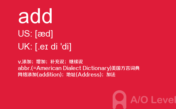 英国a-level入学考试的机会真的很少,每年就5-6月和10-11月两场考试。所以千万别因为不必要的原因,影响了a-level入学考试。为了让大家更好的在英国留学,a/o-level考试网会为大家带来a-level考试相关的资讯,一起来看看a/o-level考试网今天带来的词汇add的解析。如果您想了解alevel课程选课,上海alevel中心,英国中学排名alevel,alevel课程难吗等关于a-level考试的相关资讯,请继续浏览并关注课窝a/o-level考试网。