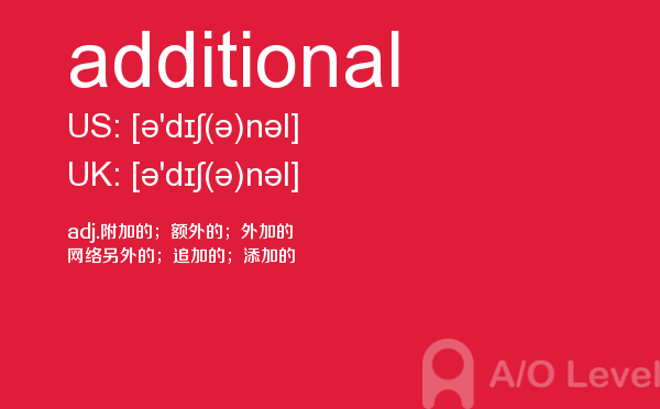 随著学生的素质提升,各大a-level课程培训班的师资和英国a-level题库也不断的完善,近年来学生考出来a-level分数也不断上涨。但是去英国留学,对英国留学资讯和英国的a-level考试资讯都是需要了解的,下面一起跟着a/o-level考试网来看看a-level词汇之additional的详细介绍。如果您想了解新加坡a水准预科,查询alevel考试报名信息2018,alevel化学提纲,alevel考试介绍等关于a-level考试的相关资讯,请继续浏览并关注课窝a/o-level考试网。