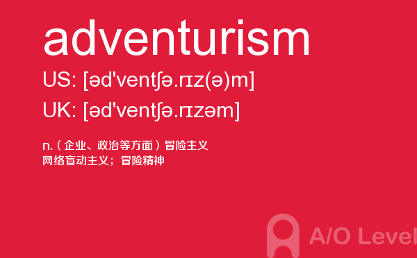 英国a-level入学考试的机会真的很少,每年就5-6月和10-11月两场考试。所以千万别因为不必要的原因,影响了a-level入学考试。为了让大家更好的在英国留学,a/o-level考试网会为大家带来a-level考试相关的资讯,一起来看看a/o-level考试网今天带来的词汇adventurism的解析。如果您想了解alevel写作时间,alevel奖学金,alevel考试大纲,a水准考试时间等关于a-level考试的相关资讯,请继续浏览并关注课窝a/o-level考试网。