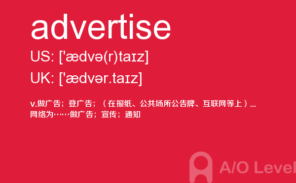 对于a-level考试,我们一再强调要加强a-level考试真题实战,多做英国a-level考试真题。放松一下,跟着a/o-level考试网来积累一下a-level考试中你会用到的单词advertise,对你的a-level考试会有很大的帮助。如果您想了解alevel数学真题2018,alevel真题下载,上海a水准培训,中国alevel成绩申请国外名校等关于a-level考试的相关资讯,请继续浏览并关注课窝a/o-level考试网。