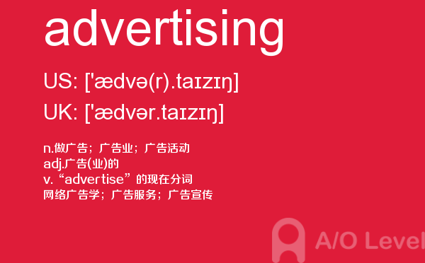 英国留学考试a-level考试考什么?a-level考试题型一定要注意积累和总结。课窝a/o-level考试网小编每天会给大家带来a-level考试的相关资讯,今天带来a-level单词advertising的解析,希望大家认真的积累a-level考试词汇。如果您想了解alevel考试评分标准,alevel物理测试题,alevel考试登记,南京alevel中心等关于a-level考试的相关资讯,请继续浏览并关注课窝a/o-level考试网。
