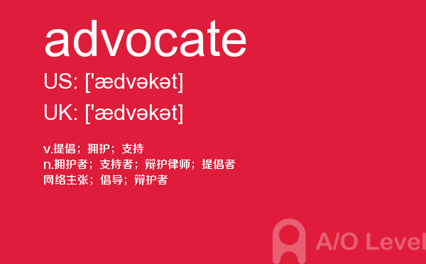 随著学生的素质提升,各大a-level课程培训班的师资和英国a-level题库也不断的完善,近年来学生考出来a-level分数也不断上涨。但是去英国留学,对英国留学资讯和英国的a-level考试资讯都是需要了解的,下面一起跟着a/o-level考试网来看看a-level词汇之advocate的详细介绍。如果您想了解alevel考试费用,a水准一年,alevel英语是什么,新加坡a水准学费等关于a-level考试的相关资讯,请继续浏览并关注课窝a/o-level考试网。