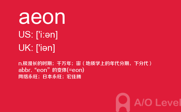 英国a-level学校,从教学质量上来看私立学校更占优势,大部分中国留学生也选择私立学校来读,不过一般都是提前一年来申请学校。中国目前也有20几所a-level学校,每年也同样有走进剑桥牛津等世界顶级大学的学生。所以在国外和在国内都可以选择a-level学校来学习。在前面关于a-level选校的问题已经详细介绍过,那么今天a/o-level考试网小编主要想介绍的是a-level重难点词汇aeon。希望对大家有帮助。如果您想了解alevel物理考a难吗,alevel时间,alevel零基础,alevel课程等关于a-level考试的相关资讯,请继续浏览并关注课窝a/o-level考试网。