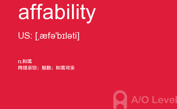 今天课窝a/o-level考试网小编给大家带来alevel考试至关重要的内容a-level单词affability的详细介绍。希望大家能够认真的阅读,在备考a-level中会用到,关于a-level考试时间,alevel考试费用等相关问题,可以关注课窝a/o-level考试网。如果您想了解交大alevel学费,新加坡大学alevel,alevel考试网,alevel词汇等关于a-level考试的相关资讯,请继续浏览并关注课窝a/o-level考试网。