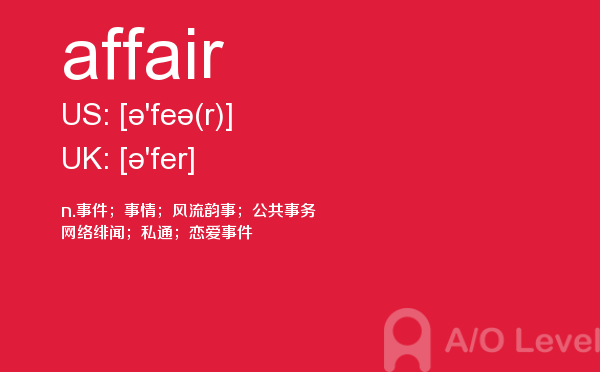 课窝a/o-level考试网上提供了许多信息可以供考生们参考,比如考生需要在此网站报名,打印准考证,或者搜寻与英国a-level考试内容相关的资料等等。考生如果想在短时间内,迅速掌握a-level考试资讯,就需要合理运用此网站的信息。今天带来的是a-level考试词汇之affair的详细介绍。如果您想了解为什么要考alevel课程,英国alevel官网,上海alevel学校排名,alevel澳洲等关于a-level考试的相关资讯,请继续浏览并关注课窝a/o-level考试网。
