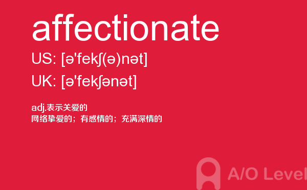 a-level 的考试将由所属的考试委员会分别于每年5-6月和10-11月在全球统一组织,成绩分别在8月和次年2月公布。关于a-level考试时间的具体内容,alevel考试网前面详细介绍过,大家可以查找alevel考试网前面的a-level考试资讯,alevel考试网每天会更新大量的alevel考试资讯,本篇要给大家介绍a-level单词affectionate的全面介绍。如果您想了解alevel国外考试,alevel词汇,alevel教育网,alevel物理考试2018等关于a-level考试的相关资讯,请继续浏览并关注课窝a/o-level考试网。