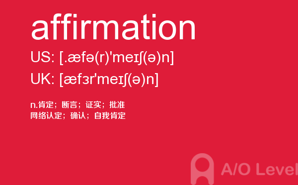 a-level课程证书被几乎所有英语授课的大学作为招收新生的入学标准。 在中国开设a-level课程旨在为中国学生提供进入国外大学的有效途径,具体目标为:培养在国内初高中成绩优秀的学生进入世界顶尖大学;培养在国内初高中成绩中等的学生进入世界一流大学;培养在国内初高中成绩一般的学生考取适合自己的大学。今天alevel考试网小编给大家详细解析a-level考试单词affirmation。如果您想了解alevel考试日期,alevel物理,alevel历年考试,英国alevel高中等关于a-level考试的相关资讯,请继续浏览并关注课窝a/o-level考试网。