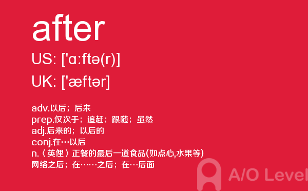 随著学生的素质提升,各大a-level课程培训班的师资和英国a-level题库也不断的完善,近年来学生考出来a-level分数也不断上涨。但是去英国留学,对英国留学资讯和英国的a-level考试资讯都是需要了解的,下面一起跟着a/o-level考试网来看看a-level词汇之after的详细介绍。如果您想了解alevel考试教材,alevel考试试题,alevel考试报名官网,alevel考试哪两个阶段等关于a-level考试的相关资讯,请继续浏览并关注课窝a/o-level考试网。