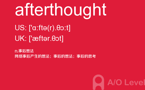 英国以其高质量的教学闻名于世,如果你还在思考a-level考试值不值得考?近几年的英国留学a-level考试的热潮足以证明一切!课窝a/o-level考试网会给大家带来a-level考试真题,a-level考试如何复习?等所有有关的a-level考试资讯。课窝a/o-level考试网今天带来a-level考试中很重要的单词afterthought的详细解析,会对你有帮助。如果您想了解alevel证书,爱德思alevel真题,alevel经济2017试卷,新加坡alevel等关于a-level考试的相关资讯,请继续浏览并关注课窝a/o-level考试网。