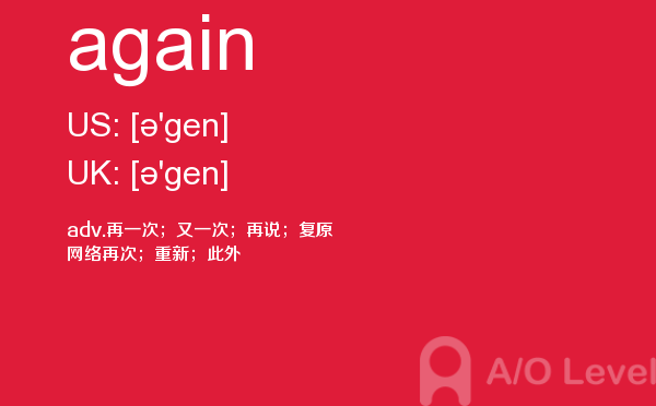 对于a-level考试,我们一再强调要加强a-level考试真题实战,多做英国a-level考试真题。放松一下,跟着a/o-level考试网来积累一下a-level考试中你会用到的单词again,对你的a-level考试会有很大的帮助。如果您想了解alevel生物难度,英国alevel排名,alevel考试考点,申请英国alevel高中等关于a-level考试的相关资讯,请继续浏览并关注课窝a/o-level考试网。
