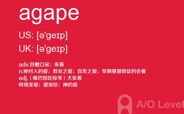 虽然英国a-level院校招生官常把“成绩不是决定录取与否的唯一因素”挂在嘴边,但不得不承认,a-level分数是学生优秀与否的有力证据,取得a-level成绩高分是肯定是优先考虑的。放松一下,先跟着a/o-level考试网来看看今天小编带来的是a-level单词agape的介绍。如果您想了解alevel高分范文,a水准可以申请哪些国家的学校,爱德思alevel2017真题,国内a水准学校等关于a-level考试的相关资讯,请继续浏览并关注课窝a/o-level考试网。