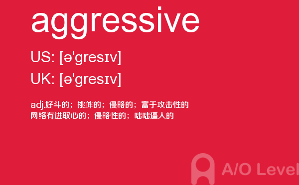 英国a-level考试是英国留学生去英国留学需要参加的考试,很多考生担心a-level考试分数要求高,英国a-level考试难度大,别担心,只要认真的学习a-level考试内容,小编相信大家一定能够考得a-level高分。今天a/o-level考试网给大家带来单词aggressive的全面解析。如果您想了解alevel写作真题,alevel写作分数,新加坡a水准报名费,新alevel等关于a-level考试的相关资讯,请继续浏览并关注课窝a/o-level考试网。