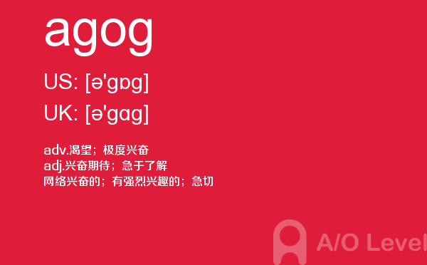 a-level的成绩分为a、b、c、d、e、u六个等级,a为最优,e为通过,u为不及格。如果学生对某门课的成绩不满意,可以选择重考,最终成绩以最好的一次为准。那么a-level考试想要取得a-level高分大家需要做到哪些呢?a/o-level考试网给大家带来的很多a-level考试经验,alevel考试技巧等等,想要考好a-level考试,不仅要知道这些,对于关于a-level考试的所有资讯都需要了解,最重点的是a-level词汇量的积累,今天a/o-level考试网就给大家带来的a-level的考试单词agog的全面解析。如果您想了解a水准考试难度,a水准简单吗,为什么要考alevel课程,英国alevel课程等关于a-level考试的相关资讯,请继续浏览并关注课窝a/o-level考试网。