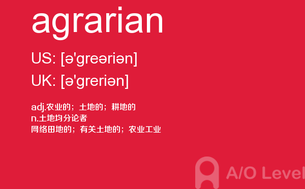 英国a-level学校,从教学质量上来看私立学校更占优势,大部分中国留学生也选择私立学校来读,不过一般都是提前一年来申请学校。中国目前也有20几所a-level学校,每年也同样有走进剑桥牛津等世界顶级大学的学生。所以在国外和在国内都可以选择a-level学校来学习。在前面关于a-level选校的问题已经详细介绍过,那么今天a/o-level考试网小编主要想介绍的是a-level重难点词汇agrarian。希望对大家有帮助。如果您想了解alevel官方报名,alevel美术课程,alevel数学难度,alevel高数等关于a-level考试的相关资讯,请继续浏览并关注课窝a/o-level考试网。