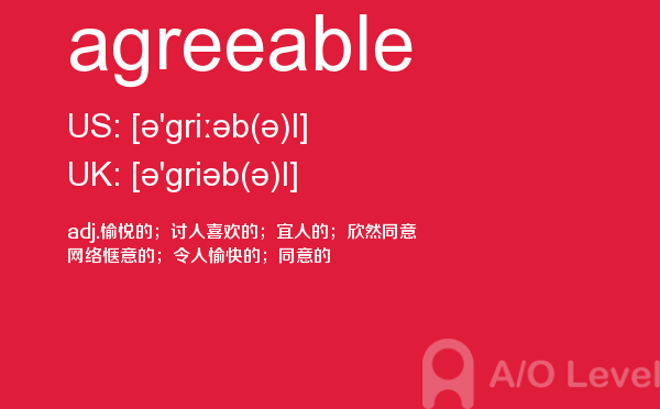 在a-level备考的过程中,想要冲刺到a-level写作的高分,相信大家都应该会知道,除了需要掌握a-level写作的一些技巧之外,优化文章中的词汇和句型也是冲刺高分的关键所在。也就是说,只有充分掌握了语法知识,才能让我们的的文章更为丰富形象。除了a-level写作,在a-level其他方面同学们也需要了解,下面课窝a/o-level考试网小编给大家带来a-level单词agreeable的介绍。如果您想了解alevel物理常备词汇,alevel官方网站,alevel数学公式,alevel培训学费等关于a-level考试的相关资讯,请继续浏览并关注课窝a/o-level考试网。