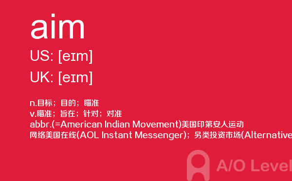 目前,a/olevel逐渐为人所熟知,很多学生都会主动了解alevel考试流程。同时也会抱怨a-level英语题比较难,任务重。那现在我们就放松一下,跟着a/o-level考试网小编来看看a-level考试中要积累的单词aim,认真的学习积累。如果您想了解alevel非全日制培训,新加坡a水准好考吗,爱德思alevel中国官网,爱德斯alevel等关于a-level考试的相关资讯,请继续浏览并关注课窝a/o-level考试网。