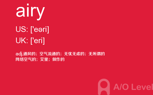 英国留学对于留学成绩的比拼越来越激烈,申请英国院校留学的一大指标a-level考试分数要求也水涨船高.虽然成绩只是申请的一部分,但不得不说,好看的英国a-level成绩是学生是否优秀的证据。放松一下跟着a/o-level考试网来学习一下a-level考试词汇airy的应用。如果您想了解alevel考试机经,alevel真题试卷,alevel都有什么课程,alevel课程多久等关于a-level考试的相关资讯,请继续浏览并关注课窝a/o-level考试网。