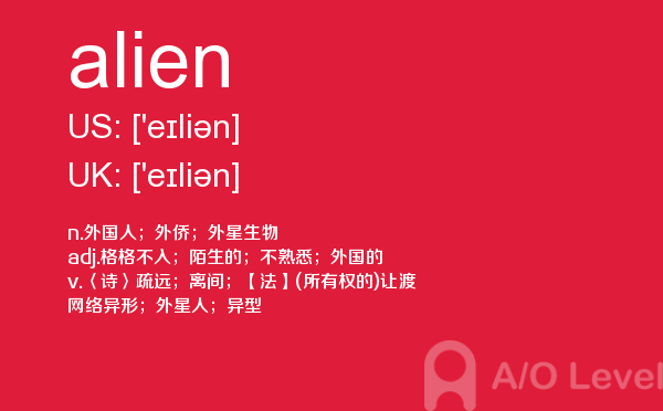 今天课窝a/o-level考试网小编给大家带来alevel考试至关重要的内容a-level单词alien的详细介绍。希望大家能够认真的阅读,在备考a-level中会用到,关于a-level考试时间,alevel考试费用等相关问题,可以关注课窝a/o-level考试网。如果您想了解交大alevel学费,新加坡大学alevel,alevel考试网,alevel词汇等关于a-level考试的相关资讯,请继续浏览并关注课窝a/o-level考试网。