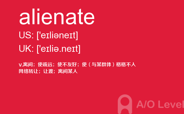 英国a-level入学考试的机会真的很少,每年就5-6月和10-11月两场考试。所以千万别因为不必要的原因,影响了a-level入学考试。为了让大家更好的在英国留学,a/o-level考试网会为大家带来a-level考试相关的资讯,一起来看看a/o-level考试网今天带来的词汇alienate的解析。如果您想了解新加坡alevel考试时间,新加坡a水准数学考试,南京alevel中心,上海alevel培训班等关于a-level考试的相关资讯,请继续浏览并关注课窝a/o-level考试网。