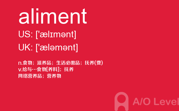 a-level课程适用于年龄在15—18之间,初中毕业以上的在校中学生或具有同等学历的职高生,通常国内a-level学校招收的是高二毕业的学生,并要求参加相关的入学考试,由于a-level课程包括教学及试卷习题等都是英文形式出现,所以这要求学生有较高的英文水平。对于a-level考试适用对象有初步了解之后,下面alevel考试网给大家带来的alevel考试中你需要重点记住的单词aliment的详细介绍。如果您想了解alevel词汇量测试,alevel课程设置,alevel考试在中国,alevel数学评分标准等关于a-level考试的相关资讯,请继续浏览并关注课窝a/o-level考试网。