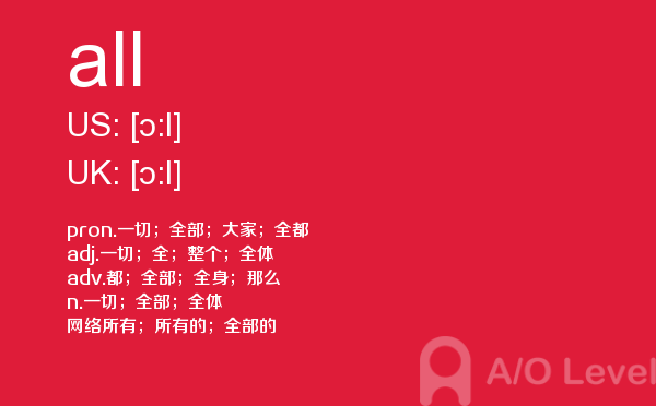 英国a-level入学考试的机会真的很少,每年就5-6月和10-11月两场考试。所以千万别因为不必要的原因,影响了a-level入学考试。为了让大家更好的在英国留学,a/o-level考试网会为大家带来a-level考试相关的资讯,一起来看看a/o-level考试网今天带来的词汇all的解析。如果您想了解bc和alevel哪个好,国内知名alevel培训,alevel课程物理,a水准考试要求等关于a-level考试的相关资讯,请继续浏览并关注课窝a/o-level考试网。