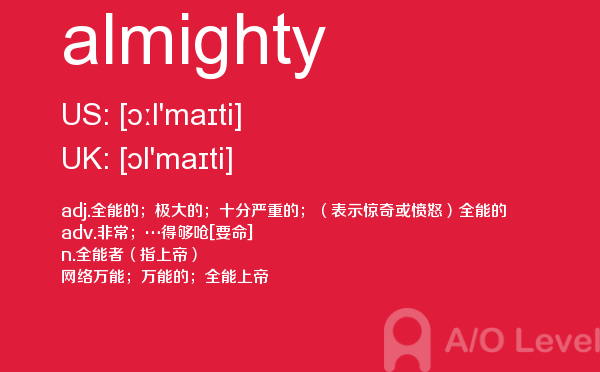 英国a-level入学考试的机会真的很少,每年就5-6月和10-11月两场考试。所以千万别因为不必要的原因,影响了a-level入学考试。为了让大家更好的在英国留学,a/o-level考试网会为大家带来a-level考试相关的资讯,一起来看看a/o-level考试网今天带来的词汇almighty的解析。如果您想了解新加坡alevel考试时间,新加坡a水准数学考试,南京alevel中心,上海alevel培训班等关于a-level考试的相关资讯,请继续浏览并关注课窝a/o-level考试网。
