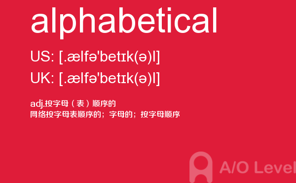 英国a-level考试报名费很好解决,那怎样才能达到a-level考试词汇量要求呢?别再纠结于a-level考试分数要求了,今天我们来一起看看a/o-level考试网今天带给你的a-level单词alphabetical的讲解。如果您想了解alevel课程有年龄限制,爱德思alevel2017真题,alevel化学辅导,a水准考试等关于a-level考试的相关资讯,请继续浏览并关注课窝a/o-level考试网。