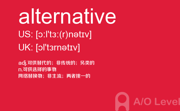 英国高中课程(a-level)的学制为两年:第一年称为as水准,学生通常选择自己最擅长且最有兴趣的3—4门课,通过考试后获得as证书。第二年称为a2水准,学生可选择as水准中优秀的3门课继续学习,通过考试后获得a-level证书。关于a-level学制相信大家肯定有一定的了解,今天alevel考试网想要带大家了解的并不是a-level学制的问题,想要介绍的是a-level重难点单词alternative,希望对大家有帮助。如果您想了解alevel新加坡,alevel国际课程介绍,alevel物理,alevel报名等关于a-level考试的相关资讯,请继续浏览并关注课窝a/o-level考试网。