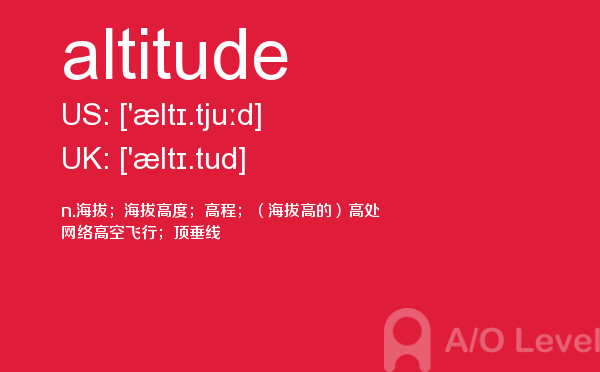 a-level课程证书被几乎所有英语授课的大学作为招收新生的入学标准。 在中国开设a-level课程旨在为中国学生提供进入国外大学的有效途径,具体目标为:培养在国内初高中成绩优秀的学生进入世界顶尖大学;培养在国内初高中成绩中等的学生进入世界一流大学;培养在国内初高中成绩一般的学生考取适合自己的大学。今天alevel考试网小编给大家详细解析a-level考试单词altitude。如果您想了解alevel考试日期,alevel物理,alevel历年考试,英国alevel高中等关于a-level考试的相关资讯,请继续浏览并关注课窝a/o-level考试网。