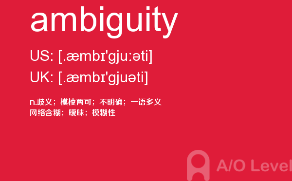 对于a-level考试,我们一再强调要加强a-level考试真题实战,多做英国a-level考试真题。放松一下,跟着a/o-level考试网来积累一下a-level考试中你会用到的单词ambiguity,对你的a-level考试会有很大的帮助。如果您想了解alevel生物难度,英国alevel排名,alevel考试考点,申请英国alevel高中等关于a-level考试的相关资讯,请继续浏览并关注课窝a/o-level考试网。