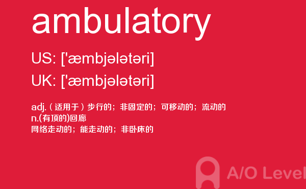英国a-level学校,从教学质量上来看私立学校更占优势,大部分中国留学生也选择私立学校来读,不过一般都是提前一年来申请学校。中国目前也有20几所a-level学校,每年也同样有走进剑桥牛津等世界顶级大学的学生。所以在国外和在国内都可以选择a-level学校来学习。在前面关于a-level选校的问题已经详细介绍过,那么今天a/o-level考试网小编主要想介绍的是a-level重难点词汇ambulatory。希望对大家有帮助。如果您想了解alevel写作真题,上海alevel学校,alevel考试的考生年龄上限是多少,alevel费用等关于a-level考试的相关资讯,请继续浏览并关注课窝a/o-level考试网。