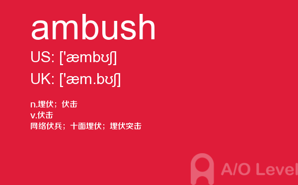 对于a-level考试,我们一再强调要加强a-level考试真题实战,多做英国a-level考试真题。放松一下,跟着a/o-level考试网来积累一下a-level考试中你会用到的单词ambush,对你的a-level考试会有很大的帮助。如果您想了解alevel经济真题及答案,新加坡读a水准,英国alevel中文,alevel培训学校等关于a-level考试的相关资讯,请继续浏览并关注课窝a/o-level考试网。