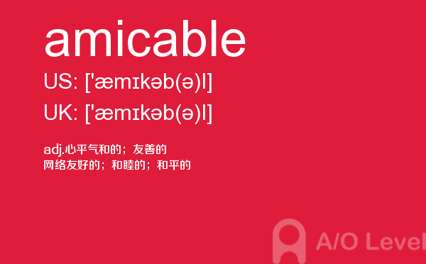 a-level课程包含70多门供学生选择,一般学生选择3至4门来学,中国学生在数学学科上有很大的优势,一般学生都会选择基础数学。学生选择课程时,一般要考虑现在自己的优势科目和将来的发展方向,即你想选择哪个大学、什么专业,从而根据他们的要求有的放矢地选课。关于alevel选课后续会详细介绍,下面带来a-level考试词汇amicable的详细介绍。如果您想了解中国alevel就读人数,alevel考试卷,alevel辅导班,alevel中考等关于a-level考试的相关资讯,请继续浏览并关注课窝a/o-level考试网。